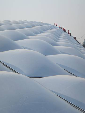 不僅如此,這種膜還具有良好的聲學(xué)性能,可有效消除回聲避免了玻璃層頂產(chǎn)生的噪音;具有的自清潔功能,使灰塵不易附在其表面。這種材料另外的一大優(yōu)點(diǎn)就是可在現(xiàn)場(chǎng)預(yù)制成薄膜氣泡,方便施工和維修;近年來(lái),由ETFE 制成的膜材料替代傳統(tǒng)的玻璃和其它高分子采光板用于大型建筑物的屋面或墻體,顯示出無(wú)可比擬的優(yōu)勢(shì)。