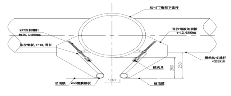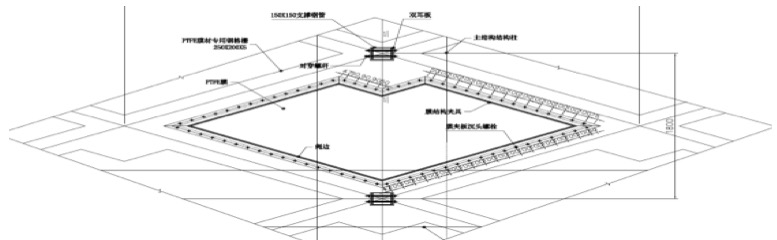 雖然預(yù)張力對(duì)骨架式膜結(jié)構(gòu)的形態(tài)的影響不及張拉膜,但也必須引入足夠大的張力,保證結(jié)構(gòu)受力特性,避免在風(fēng)荷載作用下膜面發(fā)生較大震動(dòng),導(dǎo)致松弛膜面凹陷。骨架一般暴露于膜內(nèi)側(cè),而且膜的透光性更加突顯骨架的室內(nèi)視覺(jué)效果,因此,骨架的布置、形式、材料、節(jié)點(diǎn)等是設(shè)計(jì)考慮的重點(diǎn),要力求簡(jiǎn)潔、美觀。