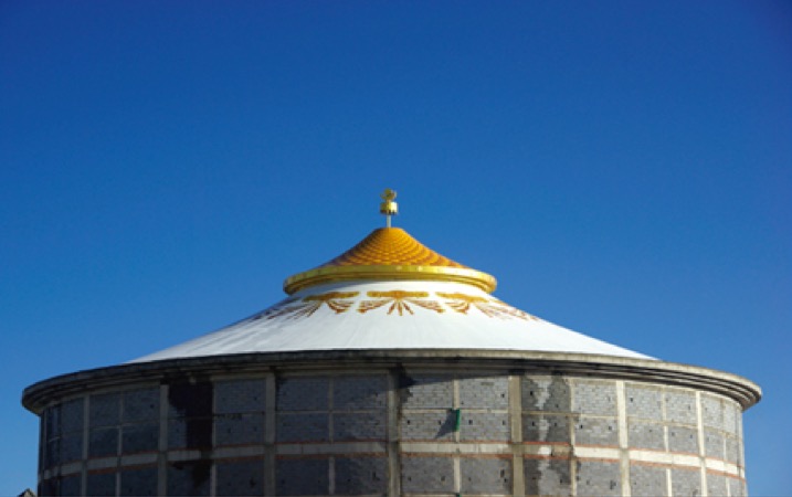 建筑外形是城市公共空間與建筑空間相鄰的界面,成為城市空間的組成部分。它是人們視覺最先接觸的部分,因此,除了功能以外,還應有很強的標識性,并能體現建筑的個性,是建筑環境和城市景觀的重要組成部分。由于膜結構自然的曲線美是其他結構類型無法比擬的,故成為近來建筑入口及屋頂經常采用的形式。剛察演藝中心外層膜面為PVDF涂層膜材上面采用高頻焊接上,體現藏飾風格明顯的金黃色膜材,有很強的名族特色表現力。